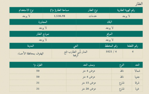 ▪︎ رقم الارض 4 ▪︎ المساحة 1,538 م ▪︎ شارع 20 × 15 × 4 × 4 ▪︎ الأطوال والأبعاد 31 × 50 ▪︎ على السوم ▪︎ رخصة فال 1200009258 171 views موقع العقار
