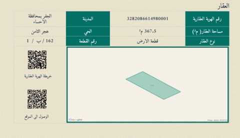 ▪︎ رقم الارض 162-1 ▪︎ الحرف ب ▪︎ المساحة 367 م ▪︎ شارع 15 ▪︎ السعر 200,000 ريال ▪︎ رخصة فال 1200009258 67 views موقع العقار