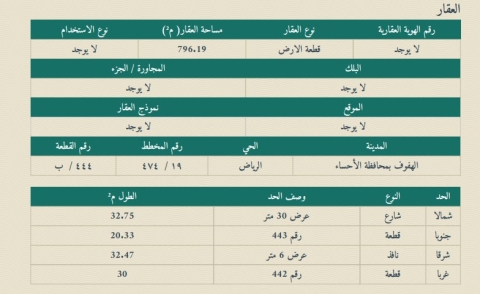 ▪︎ رقم الارض 444 ▪︎ الحرف ب ▪︎ المساحة 796 م ▪︎ شارع 30 × 6 ▪︎ السوم 320,000 ريال ▪︎ رخصة فال 1200009258 70 views