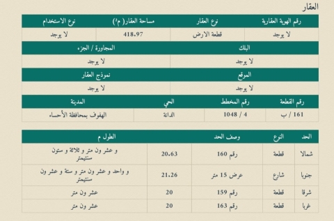 ▪︎ رقم الارض 161 ▪︎ الحرف ب ▪︎ المساحة 419 م ▪︎ شارع 15 ▪︎ السعر 400,000 ريال ▪︎ رخصة فال 1200009258 40 views موقع العقار
