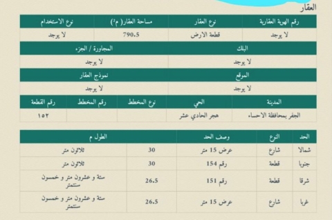 ▪︎ رقم الارض 152 ▪︎ المساحة 790 م ▪︎ شارع 15 × 15 ▪︎ الأطوال والأبعاد 26.5 × 30 ▪︎ السعر 410,000 ريال ▪︎ رخصة فال 1200009258 35 views موقع العقار